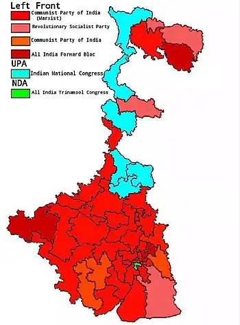 The Communist Party of India (Marxist) led Left Front had an overwhelming victory in the state by winning 35 seats.[3][4] On the national level, Indian National Congress became the single largest party and formed the new government with its allies and taking external support from Left Front and other parties.[5][6]