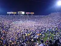The Hawkeyes then raised their record to 8–2 with victories over Illinois, Purdue, and Minnesota.[1] With a share of the Big Ten championship on the line, the Hawkeyes met Wisconsin in the final regular season game of the year. Iowa won the game,[7] completing its second consecutive unbeaten season at home, and thousands of Hawkeye fans swarmed the field in celebration.[8] Several weeks following the victory, Iowa accepted a bid to play the LSU Tigers in the 2005 Capital One Bowl.[9]