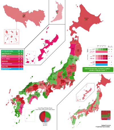 The opposition Democratic Party won a plurality of the popular vote and seats contested in the election, sweeping the liberal urban areas. The ruling Liberal Democratic Party failed to win in its strongholds but once more received most of its support from the agrarian areas. New Komeito did well, reaching its goals, as did the Social Democratic Party. The Japanese Communist Party did not reach its goals, while independents won the rest of the seats. The Liberal League and Green Political Assembly failed to win any seats.