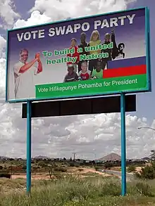 General elections were held in Namibia on 15 and 16 November 2004 to elect the President and National Assembly. The National Assembly election resulted in a landslide win for SWAPO, which won 55 of the 78 seats with over 75% of the vote. SWAPO's candidate for president, Hifikepunye Pohamba, won the presidential election.[1] Following his victory, Pohamba was sworn in as president on 21 March 2005 at Independence Stadium in Windhoek.[2]