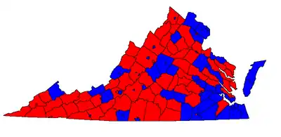 While the previous Democratic Governor, Mark Warner, was credited with doing especially well for a Democrat in rural areas of the commonwealth, Kaine's win featured surprising triumphs in traditionally Republican areas such as Virginia Beach, Chesapeake, and the Northern Virginia suburbs of Prince William County and Loudoun County, as well as impressive showings in Democratic strongholds such as Richmond and Norfolk.[2] This is the most recent election in which a Virginia governor and lieutenant governor of opposite parties were elected.