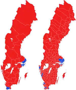Reinfeldt reached out to working-class votes in the re-branding as the 'New Moderates', which resulted in sizeable gains in historically left-wing locations in densely populated areas. As a result, several municipalities that had never voted blue before in Stockholm County flipped.[1] This, combined with a landslide overall win in the capital region as a whole and strong showings in Scania tipped the balance in favour of the Alliance. The centre-right bloc also flipped the crucial populous municipalities Gothenburg, Linköping, Uppsala and Västerås.[1]