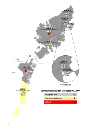Elections to Comhairle nan Eilean Siar (Western Isles council) were held on 3 May 2007, the same day as the other Scottish local government elections and the Scottish Parliament general election. The election was the first one using 9 new wards created as a result of the Local Governance (Scotland) Act 2004,[1] each ward elected three or four councillors using the single transferable vote system form of proportional representation. The new wards replaced 31 single-member wards which used the plurality (first past the post) system of election.