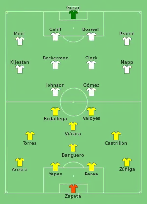 1. Hugo Rodallega played as a goalkeeper after Róbinson Zapata was sent off.