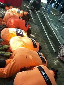 On 3 November 2007, a demonstration involving about 150 people took place outside a Labour Party conference. Some protesters wearing orange boiler suits had chained themselves together with gags in their mouths and a word such as "terrorist", "Māori" or "anarchist" on their backs. Others held placards with the slogans "State terrorists kidnapped our friends" and "Free political prisoners".[103] Len Richards, a Labour Party delegate allegedly struck a protester in the face with a megaphone, though he claimed "there was no violence" despite TV3 showing footage of the incident.[104] According to the Workers Party, the protester was one of their members.[105] Three men were arrested at the protest: the first was attempting to break the police line and enter the conference venue, the second was pulled off the top of a police van and a third was arrested from within the crowd. Security personnel at the venue had been significantly increased from the previous day.[103]