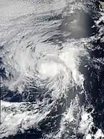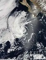 A vigorous tropical wave emerged off the western coast of Africa on August 16. Characterized with abundant deep convection, the wave remained organization until it interacted with an upper-level trough across the eastern Caribbean Sea a few days later. On August 26, the wave split in two, with the northern portion leading the formation of a weak low in the Bay of Campeche and the southern portion continuing westward into the eastern Pacific. After the formation of deep convection over the center and associated convective bands, the disturbance was upgraded to a tropical depression at 1200 UTC on August 29.[46] Though the circulation remained positioned on the northeast side of most thunderstorm activity, satellite intensity estimates supported tropical storm strength and it was upgraded to such accordingly.[47] At 1200 UTC on August 30, Gil attained its peak intensity with winds of 45 mph (75 km/h) and a minimum barometric pressure of 1001 mb (hPa; 29.56 inHg). Shortly thereafter, increasing wind shear and decreasing sea surface temperatures caused the system to steadily weaken; at 0000 UTC on September 1, the system deteriorated into a tropical depression, and by 1800 UTC the following afternoon, the system no longer displayed enough organization to be considered a cyclone. The remnant low continued westward and dissipated twelve hours later.[46]