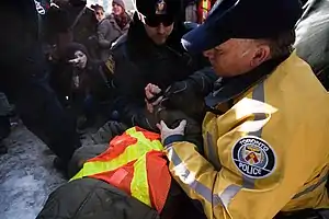 ![]() A CUPE 3903 picketer is arrested during a protest against back to work legislation on January 26th, 2009. It was one of the final sizable protests before the end of the strike | |||