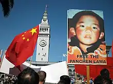 A People's Republic of China flag and a Free Panchen Lama poster with a picture of Gedhun Choekyi Nyima. The Ferry Building can seen in the background.