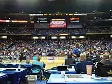 During overtime of the Friday night quarterfinal between Mississippi State and Alabama, a tornado hit the Georgia Dome at 9:40 p.m.[4] The National Weather Service had issued a tornado warning at 9:26 p.m., because radar indicated a thunderstorm capable of producing a tornado.[5] The storm tore open a panel on the north side of the dome; sheared bolts and insulation fell into the arena. After the storm passed, the teams returned to the court at 10:30 and completed the game.[4]