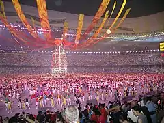 - Mass games performance by a troupe of drummers.