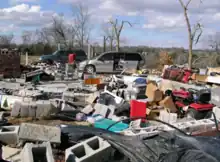 The tornado then tracked into Trousdale County and passed through rural areas to the northwest of Hartsville, weakening slightly to high-end EF2 strength. Frame homes were damaged or destroyed, vehicles were tossed and damaged, numerous trees were snapped and denuded, and mobile homes were obliterated with debris and insulation strewn long distances downwind. Ten homes were destroyed, and 23 homes had major damage along this segment of the path. As a result of the tornado, a major fire occurred as a natural gas plant was ripped apart by the tornado in the southwestern portion of the county. The area was evacuated and no one was injured at the plant. Two people were killed at a home along U.S. Route 231, and five other people were injured in the county.[65][66][4][67] Crossing into Macon County, the tornado regained EF3 intensity as it struck the western and northern sections of Lafayette, resulting in widespread, major destruction in the area. Numerous homes and several churches were destroyed in Lafayette, with several leveled to the ground. An auto sales business in town sustained heavy damage as well. Surveyors observed major damage to a large, expensive brick home that was built unanchored on a very weak, unreinforced cinder block foundation. The house shifted off the foundation during the tornado, causing walls to buckle and collapse. 170 homes were destroyed, and 9 homes had major damage in the Lafayette area. Thirteen people were killed in and around town, and 44 others were injured. President George W. Bush toured the Macon County destruction on February 8 and promised relief to individuals.[68] The logging industry in Macon County was hit hard, with about a million dollars worth of trees destroyed. Debris from Lafayette was found as far north as Sano, Kentucky, in Adair County, approximately 70 miles (113 km) to the northeast.[69] Sixteen thousand TVA electricity customers in Macon and Trousdale Counties lost power, some of whom did not have their service restored for a week.[70][71] Macon County schools were closed until February 19.[72][73][74][75] In total, roughly 260 houses in the three Tennessee counties were destroyed, and damage amounts were estimated at $78 million in Macon County alone.[76][77]