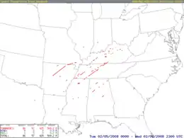 A total of 57 people were killed across four states and 18 counties, with hundreds of others injured.[4] The outbreak, at the time, was the deadliest in the era of modern NEXRAD doppler radar, which was fully implemented in 1997.[5] The event was the second deadliest in February since 1950 behind the Tornado outbreak of February 21–22, 1971, which killed 123,[6] the deadliest outbreak in both Tennessee and Kentucky since the 1974 Super Outbreak,[7] and was at the time the deadliest tornado outbreak in the US overall since the 1985 United States–Canada tornado outbreak which killed 76 people.[8] This record would not be surpassed until the 2011 Super Outbreak which killed 324 people. Damage from tornadoes was estimated at over $500 million (2008 USD).[9]