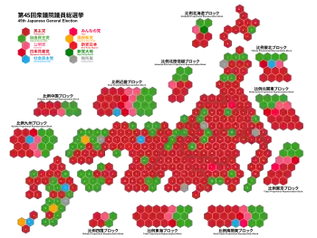 General elections were held in Japan on August 30, 2009 to elect the 480 members of the House of Representatives. The opposition Democratic Party of Japan (DPJ) defeated the ruling coalition (Liberal Democratic Party (LDP) and New Komeito Party) in a landslide, winning 221 of the 300 constituency seats and receiving 42.4% of the proportional block votes for another 87 seats, a total of 308 seats to only 119 for the LDP (64 constituency seats and 26.7% of the proportional vote).[1][2][3]