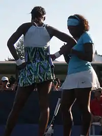 Vying for their first title as a team at the US Open in ten years, the Williams sisters made quick work of their first three opponents Julia Görges and Arantxa Parra Santonja, Yung-Jan Chan and Katarina Srebotnik, and Sorana Cîrstea and Caroline Wozniacki defeating them all in straight sets.[78] In the quarterfinals they defeated Yan Zi and Zheng Jie defeating them in two tight sets.[79] In the semifinals, they faced the Russian pairing of Alisa Kleybanova and Ekaterina Makarova and won the first set in tie-break. However, they lost the second set ending their 29-set winning streak. The final set went to the Williams sisters as they advance to the final.[80] In the final, they faced top ranked doubles team of Cara Black and Liezel Huber and took control of the match to claim their tenth slam as a team and their second US Open crown.[81]