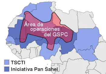 Map showing GSPC area of operations (pink), member states of the Pan Sahel Initiative (dark blue), and members of the Trans-Saharan Counterterrorism Initiative (dark and light blue) as of 2011.