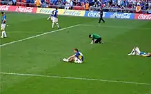 Cardiff kicked off the match around 3 p.m. in front of a Wembley Stadium crowd of 82,244.[36][37] They began as the more attacking of the teams, with Peter Whittingham playing a cross into the box where Chopra was able to beat opposition defender Alex Baptiste to the ball, hitting the crossbar with his resulting shot four minutes into the match.[37][38] Five minutes later, Whittingham again played in Chopra, allowing the striker to score past Blackpool goalkeeper Matt Gilks into the bottom corner of the net. Four minutes later Cardiff conceded a free kick on the edge of their penalty area when Stephen McPhail was adjudged by Marriner to have deliberately handled the ball. Adam hit the free kick around the wall and into the net to equalise. After fifteen minutes Cardiff's Bothroyd succumbed to his pre-existing hamstring injury and was substituted,[26] being replaced by loan player Kelvin Etuhu. Blackpool were able to gain control of the game as Cardiff adjusted to the change,[26] with both Stephen Crainey and DJ Campbell shooting wide from outside the penalty area.[30]