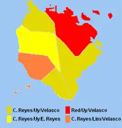 The colors indicate municipalities where a candidate gathered the majority of votes(governor/vice-governor/congressman): Dirty Yellow for Carmencita Reyes / Antonio Uy / Allan Velasco, Yellow for Carmencita Reyes / Antonio Uy / Edmundo Reyes, Orange for Carmencita Reyes / Jasper Lim / Allan Velasco and Red for Wilfredo Red / Antonio Uy / Allan Velasco. Incumbent Jose Antonio Carrion, Narciso Daquioag and incumbent vice-governor Tomas Pizarro was unable to secure a majority in any of the municipalities.