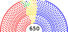 The general election was held on Thursday 6 May 2010 and saw an increase in voter turnout from 61% in 2005 to 65% in 2010.[17] Throughout the day GfK NOP and Ipsos MORI conducted an exit poll on behalf of the BBC, Sky and ITV news services – the results of which were announced as the polls closed at 10:00 pm.[30] Data gathered from individuals at 130 polling stations around the country suggested a hung parliament, with an initial estimate that the Conservative Party would achieve 307 seats – 19 seats short of a controlling majority.[31][32] This deficit was later adjusted to 21 seats. The distribution of seats was initially predicted to be 307 to the Conservatives, 255 to Labour, 59 to the Liberal Democrats and 29 to the other parties,[31] but these figures were later updated with a minor adjustment in Labour's favour.[33] The apparently poor prospects for the Liberal Democrats were a surprise to commentators,[34] as many previous opinion polls had indicated they would receive more seats. A later BBC exit poll published at 5:36 am on Friday 7 May predicted the Conservatives on 306, 20 short of an overall majority, with Labour on 262, and the Liberal Democrats on 55.[33]