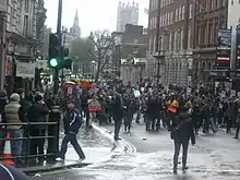 At around 6 pm, mounted police charged at the north end of the crowd to push them back; despite video evidence police denied that this was an actual charge, describing it as crowd control using horses.[42][43] Roughly 1000 protesters broke free of the police kettle, running throughout central London while pursued by police; The Guardian's Paul Lewis stated that "police were caught in a game of cat and mouse, along Charing Cross, Covent Garden and Piccadilly Circus."[39] Some of these protesters committed acts of vandalism along the side streets, including knocking over rubbish bins and throwing traffic cones into the road.[39] Various bus shelters and ticket machines in the area were vandalised, with Transport for London diverting buses away from the unrest.[38]