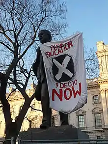 In the following days, smaller protests were held in Manchester and Cambridge, with no violent confrontations.[35] On 11 November, student protesters occupied a building at the University of Manchester for three hours, demanding to see the accounts that discussed how government funding cuts would affect students. Between 60 and 100 students held a peaceful sit-in at Manchester's John Owens Building on Oxford Road after an NUS meeting earlier that day.[35] Representing this group, protester Jeremy Buck said: "This is just what a few students who had the energy left after the London demo managed to achieve… Imagine what will happen when they have enough time to organise properly for the 24th. It is a matter of watch this space."[30] That same day, protesters at the University of Cambridge held a demonstration against the cuts at the university's annual science, engineering and technology careers fair.[30] On 23 November, anti-education cuts protesters had assembled outside of the offices of The Guardian newspaper, where Clegg was giving his Hugo Young lecture. They brought out an effigy of Clegg, sentencing it to death and executing it by hanging, shouting the slogan "Nick Clegg, shame on you, shame on you for turning blue".[36]
