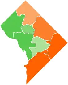 On September 15, 2010, voters went to the polls and the District of Columbia Board of Elections and Ethics reported unofficial results, with Gray receiving 53 percent of the vote compared to Fenty's 46 percent.[22] Gray won as much as 80% of the vote in predominantly black areas east of the Anacostia River, but did poorly in the city's wealthier northwest, winning just 13% in one Georgetown precinct.[23]