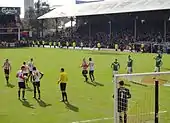 Brentford began the season with a disappointing 1–0 League Cup first round defeat to Walsall and hovered around mid-table in League One, before coming into form in late October 2012.[11] New forward Paul Hayes failed to produce regular goals and was replaced by Huddersfield Town loanee Jimmy Spencer,[12] who in turn was replaced by Marcello Trotta.[13] The Fulham loanee would remain with the Bees for the duration of the season.[14] Inspired by the form of attacking midfielder Harry Forrester,[15] an unbeaten run of 9 wins and four draws in 13 matches between 23 October 2012 and 21 January 2013 firmly established the Bees as challengers for automatic promotion, rising as high as 2nd position in the table.[11] Headway was also made in the FA Cup during the same period, with victories over Boreham Wood, Bradford City and Southend United setting up a fourth round tie versus West London neighbours Chelsea at Griffin Park on 27 January.[11] In a match televised on ITV,[16] Brentford twice took the lead (through a quick-reaction Marcello Trotta finish and a Harry Forrester penalty), but the Premier League club ensured a replay when Fernando Torres pulled the score back to 2–2 with seven minutes remaining.[17] Brentford were comfortably beaten 4–0 at Stamford Bridge in the replay,[18] which was again televised. The match ended on a sour note when Chelsea defender David Luiz's "sickening" late shoulder charge on Bees midfielder Jake Reeves went unpunished and left Reeves concussed.[19]