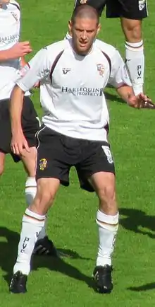 With the club's new owner in place, Adams signed six players early in July. He first signed midfielder Darren Murphy and winger Jennison Myrie-Williams (who had impressed in a loan spell at the club the previous season) from Stevenage, as well as Colchester United attacker Ashley Vincent.[2] He then made another triple swoop by bringing in Shrewsbury Town goalkeeper Chris Neal, Crewe Alexandra centre-back David Artell, and former Wales international Richard Duffy.[3] Highly rated striker Liam Dickinson, veteran forward Darren Byfield, and Irish attacker Tadhg Purcell also joined the club on trial.[4][5][6] Adams appointed Doug Loft as club captain at the end of July.[7] The pre-season tour of Ireland was hailed as a success, whilst Vale recorded wins in each of their encounters with non-League opposition.[8] However, David Artell left the club as a free agent days before the start of the season, as he refused to sign a contract that reflected the club's status as 'in administration' (the initial contract he signed listed Keith Ryder as the club's owner, and was therefore invalid).[9]