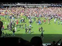 A pitch invasion ensued after promotion was secured in the final home game of the season against Northampton Town on 20 April 2013.