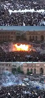 On 4 May the last official day of the campaign, during the Republican Party concert and rally in Republic Square of Yerevan, dozens of balloons filled with hydrogen exploded, resulting in the injury of at least 144 people according to the Ministry of Emergency Situations.[17] A few hours later it was reported that out of total 154 people hospitalized, 98 were still in hospitals and 28 were in intensive-care units.[18]