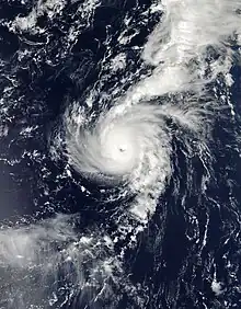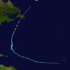 There were only two tropical cyclones that formed in September, though three systems that existed in that month originated in August.[18] Michael became the first major hurricane of the season on September 6, when it peaked as a Category 3 hurricane.[26] Hurricane Nadine developed September 10 and became extratropical on September 21. However, Nadine re-developed on September 23 and subsequently lasted until October 3. With a total duration of 24 days, Nadine was the fourth-longest lasting Atlantic tropical cyclone on record, behind the 1899 San Ciriaco hurricane, Hurricane Ginger in 1971, and Hurricane Inga in 1969.[27] In October, there were five tropical cyclones – Tropical Storms Oscar, Patty, and Tony – as well as Hurricanes Rafael and Sandy.[18] This was well above average, yet not record, activity for the month of October.[28] Hurricane Sandy outlived the final named storm, Tony, and became extratropical on October 29, ending cyclonic activity in the 2012 season.[18]