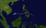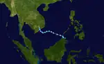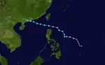 On June 25, the JMA started to monitor a tropical depression that had developed, within the monsoon trough about 1,585 km (985 mi) to the southeast of Manila, Philippines.[30][31] During that day the depression moved north-westwards and consolidated further before during the next day, PAGASA started to monitor it as Tropical Depression Dindo.[32][33] Later that day, the JMA upgraded the system to a tropical storm and named it Doksuri,[34] and the JTWC upgraded Doksuri to a tropical depression.[35] Late on the same day, the JTWC upgraded Doksuri to a tropical storm.[36] On June 27, Doksuri's low-level circulation center became exposed due to moderate easterly wind shear.[37] On June 28, the JTWC downgraded Doksuri to a tropical depression, as the system's exposed circulation center began to undergo an unusual circulation center replacement cycle, which involves a circulation center to be replaced by another new circulation center.[38] Late on June 29, Doksuri made landfall over Nanshui, Zhuhai, Guangdong, China.[39] During June 30, the JMA reported that Doksuri had weakened into a tropical depression, before reporting that the depression had dissipated later that day.[40] In Macau, the storm caused minor roof damage.[41]