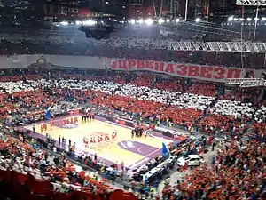 Belgrade's Kombank Arena with 19,000 spectators ahead of the Crvena zvezda vs. Lokomotiv game in October 2013, the home team's return to Euroleague after 14 seasons. The Kuban visitors ended up winning 84–87.