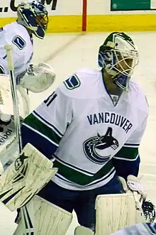 The Canucks had two competitors for the back-up goaltender position, Eddie Lack and Joacim Eriksson.[31] Lack had been seen as the heir apparent for the back-up role, but following a season-ending injury after playing only 12 games in the AHL, his future was called into question.[32] Eriksson was signed to a two-year, two-way, entry level contract with the Canucks in the off-season after helping Skellefteå AIK to the Swedish Hockey League championship.[33][34] Though neither player had any NHL experience, Lack was seen as the front runner because of his one-way contract, which paid him the same at the NHL or AHL level.[35]