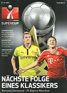 The 2013 DFL-Supercup was the fourth DFL-Supercup, an annual football match contested by the winners of the previous season's Bundesliga and DFB-Pokal competitions. It featured Bayern Munich, winners of the 2012–13 Bundesliga and the 2012–13 DFB-Pokal, and, as a result of the former winning both competitions, the Bundesliga runners-up Borussia Dortmund. The match was hosted by Dortmund at the Signal Iduna Park on 27 July 2013.[1] The match took place two months after the same teams played each other in the 2013 UEFA Champions League Final.