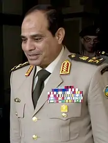 The 2013 Egyptian coup d'etat took place on 3 July 2013. Egyptian army chief General Abdel Fattah al-Sisi led a coalition to remove the democratically elected President of Egypt Mohamed Morsi from power and suspended the Egyptian constitution of 2012.[9] The move came after the military's ultimatum for the government to "resolve its differences" with protesters during widespread national protests. The military arrested Morsi and Muslim Brotherhood leaders,[10] and declared Chief Justice of the Supreme Constitutional Court Adly Mansour as the interim president of Egypt. The announcement was followed by demonstrations and clashes between supporters and opponents of the move throughout Egypt.[11]