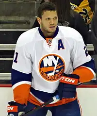 The Islanders put together a 6–3–0 January record to bring into the All-Star Game break. Near the beginning of the month, Lubomir Visnovsky was placed back on IR with an upper body injury and would later be joined by Eric Boulton with a lower-body injury, who had been taken off the list about a month prior on December 11 and only played once since. Michael Grabner returned from his lower body injury on January 6 after missing eight games.[22] On January 10, John Tavares was named to the All-Star Game as the sole representative of the Islanders. After injuries to goaltenders Jimmy Howard of the Detroit Red Wings and Pekka Rinne of the Nashville Predators, Halak and the Pittsburgh Penguins' Marc-Andre Fleury were named as their replacements.[23] At the All-Star Game, Tavares scored four goals, matching an All-Star Game record for an individual player's goals scored, while Halak stopped six of tens shots in the third period; their team, captained by Jonathan Toews of the Chicago Blackhawks, won the game by a record-setting score of 17–12.[24][25] After the break, it was announced that alternate captain Kyle Okposo would miss six-to-eight weeks after receiving an upper-body injury, later revealed to be a detached retina that he had recently received surgery for.[26] The injury led to Cal Clutterbuck being named as an alternate captain.[27] In their first game back from the break, the Islanders defeated the rival New York Rangers, earning their third consecutive victory over the team, all by a gap of three goals; this marked the first time the Islanders won three consecutive games against the Rangers since 2007.[28]
