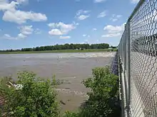 The first crest reached Brandon on July 6 with flows of 34,330 cfs below the levels of 2011 when the river crested at 36,700 cfs.[6][7] When the crest reached the Portage Reservoir on July 9, flows reached 52,100 cfs with approximately 34,100 cfs directed toward Lake Manitoba through the Portage Diversion and 18,000 cfs toward Winnipeg.[8] This was again lower than in 2011 when the river crested at the Portage Reservoir with flows of 53,100 cfs.[9]