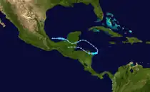 An area of low pressure interacted with an atmospheric kelvin wave, leading to the formation of a tropical depression in the Bay of Campeche at 18:00 UTC on August 31. Six hours later, the depression was upgraded to Tropical Storm Dolly. Steered generally westward by a mid-level ridge to its north, the cyclone struggled with strong wind shear and reached peak winds of 50 mph (80 km/h) at 12:00 UTC on September 2. At 04:00 UTC the next day, Dolly moved ashore just south of Tampico, Mexico, with winds of 45 mph (70 km/h). Following landfall, the mountainous terrain of eastern Mexico quickly caused the cyclone to degenerate into a remnant low at 12:00 UTC on September 3. The post-tropical low continued westward prior to dissipating the next day.[58]
