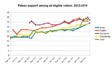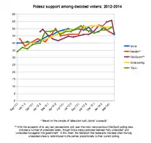- ↑ This poll has 18% undecideds, of which 10% fully undecided and 8% undecided but in favour of a change in government. In addition, this time the Nézopont poll also provides data for "potenciális szavazók", which add up to 100%, leaving no number of undecided voters. The proportions are substantively different in this data, to the advantage of the MSzP and E2014: Fidesz 42%, MSzP 23%, Jobbik 13%, LMP 6%, DK 4%, E2014 10%, Others 2%.