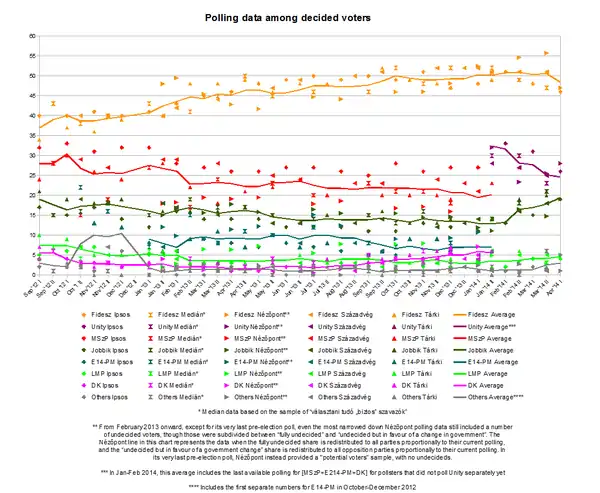 - ↑ This poll has 17% undecideds, of which 10% fully undecided and 7% undecided but in favour of a change in government. In addition, this time the Nézőpont poll also provides data for "potenciális szavazók", which add up to 100%, leaving no number of undecided voters. The proportions are substantively different in this data, to the advantage of the MSzP: Fidesz 44%, MSzP 25%, Jobbik 14%, LMP 6%, DK 3%, E2014 7%.