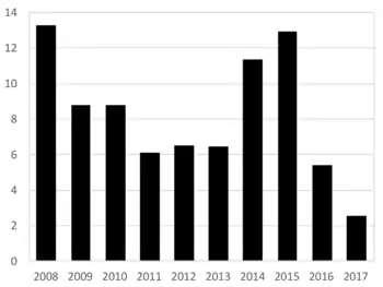 On 16 December 2014, the RTS Index, denominated in U.S. dollars, declined 12%, the most on any given day since the midst of the global financial crisis in November 2008, and the MICEX Index declined 8.1% at one point before ending the day higher. This increased the decline of RTS Index, up until 16 December, of nearly 30% during the month of December.[59] In response to rising interest rates and bank runs, the interest rate on Russian three-month interbank loans rose to 28.3%, higher than at any point in the Great Recession of 2008.[60][61]