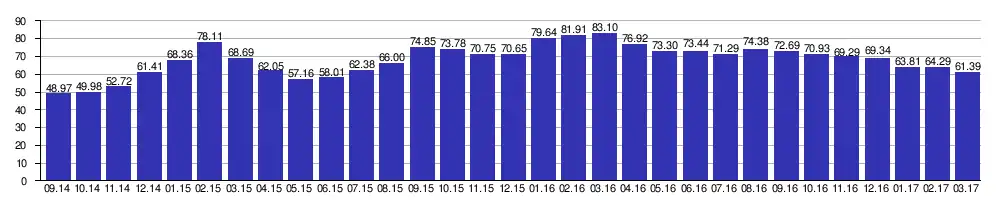 Despite the Central Bank's intervention, the rouble declined further, to as low as 79 roubles to one U.S. dollar, compared to 33 roubles to the dollar in January 2014.[48] The rouble strengthened from its lows on 16 December after the Central Bank said it would not implement capital controls.[49]