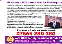 The UK Independence Party selected John Bickley, 60, a former Labour supporter[21] who grew up in Wythenshawe.[22] Bickley, who runs a mobile app firm, told The Guardian that he felt Parliament needed to "take responsibility" having "outsourced running of the country to the EU". Bickley added that he felt "Labour had let down the working class" and that Labour's behaviour would mean his former trade unionist father would be "turning in his grave".[23]