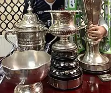 ![]() President’s Cup, FAI Cup, Leinster Senior Cup & League of Ireland Champions trophy on display in Oriel Park in 2015 | |||