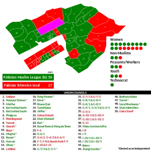 The 2015 Islamabad Local Government Elections were held on November 30 2015.[1] The Pakistan Muslim League (N) (PML(N)) obtained a landslide victory, winning 50 of the 77 seats in the Islamabad Municipal Corporation (IMC), while the Pakistan Tehreek-e-Insaf (PTI) won the remaining 27 seats.
