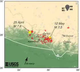 A second major earthquake occurred on 12 May 2015 at 12:50 NST with a moment magnitude (Mw) of 7.3Mw 18 km (11 mi) southeast of Kodari. The epicenter was near the Chinese border between the capital city of Kathmandu and Mount Everest. It struck at a depth of 18.5 km (11.5 miles). This earthquake occurred along the same fault as the original magnitude 7.8 earthquake of 25 April but further to the east. As such, it is considered an aftershock of the 25 April quake.[50] Tremors were also felt in northern parts of India including Bihar, Uttar Pradesh, West Bengal and other North-Indian States.[51][52][53][54] At least 153 people died in Nepal as a result of the aftershock and about 2,500 were injured. 62 others died in India, two in Bangladesh, and one in China.[26][55]