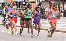 The first runners hit the 3.1-mile (5 km) point in 17:21 and the 6.2-mile (10 km) mark in 34:27.[7] By the halfway point (1:12:54), a nine-woman lead pack had emerged led by Portuguese runner Sara Moreira. They remained together until the 18-mile (29 km) mark, where a group containing Kenyans Mary Jepkosgei Keitany and Priscah Jeptoo, along with Ethiopians Aselefech Mergia and Tigist Tufa started to pull away. At the 20-mile (32 km) mark, Keitany increased her pace and began recording sub 5:20 miles. Tufa kept up with Keitany until the 22-mile (35 km) point before falling away. Keitany won the race in 2:24:25, a full minute and seven seconds in front of second placed Mergia who had overtaken Tufa in the final mile. Tufa trailed a further eighteen seconds behind in third place. Keitany's win marked the first time a woman had defended the New York Marathon title since Briton Paula Radcliffe in 2008.[2]