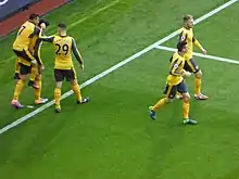 Arsenal started November with a Champions League game away to Ludogorets Razgrad. Despite the Bulgarian side going into a shock 2–0 lead early on, Arsenal eventually came back with goals through Granit Xhaka, Olivier Giroud and a late Mesut Özil goal to win 3–2 and qualify for the knockout stages. This took Arsenal's unbeaten run to 15 games in all competitions.[40][41] Arsenal then participated in the North London derby, hosting Tottenham Hotspur in Premier League action on 6 November. Arsenal gained the lead just prior to the half-time break, with Kevin Wimmer glancing Özil's free-kick past Hugo Lloris, before Spurs responded with a Harry Kane spot-kick following a tangle between Laurent Koscielny and Mousa Dembélé. Despite presses from either side late on, the game ended 1–1, and left Arsenal fourth in the Premier League going into the international break.[42] Arsenal returned to Premier League action against Manchester United at Old Trafford on 19 November. During the match, Arsenal had not had an effort on goal and often conceded to allow United to control the game for long periods, and their advances toward goal were rewarded through a Juan Mata left-foot finish after 68 minutes. During the dying moments of the game, however, a substitute Giroud rose at the far post to head home an Alex Oxlade-Chamberlain cross.[43]
