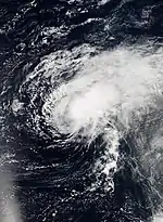 On August 17, the NHC highlighted the potential for tropical cyclogenesis off the western coast of Africa in subsequent days.[61] A weak area of low pressure associated with a tropical wave emerged into the eastern Atlantic three days later,[62] and the disturbance steadily coalesced into a tropical depression by 12:00 UTC on August 22, about 305 mi (490 km) southwest of the southernmost Cabo Verde Islands.[28] The depression organized while heading northwest, intensifying into Tropical Storm Gaston six hours later and attaining hurricane intensity by 12:00 UTC on August 24, in accordance with data from satellites and an NASA Global Hawk unmanned aircraft.[28][63] After its initial peak in intensity, Gaston's satellite appearance began to degrade as an upper-level low imparted strong southwesterly shear on the cyclone,[64] causing it to weaken back to a tropical storm.[28] Upper-level winds slackened early on August 27, and a timely microwave pass highlighted the presence of a low-level eye well embedded in the storm's central dense overcast, indicating the resumption of Gaston's intensification phase.[65]