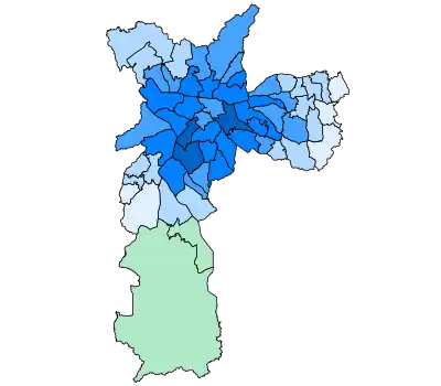 The 2016 São Paulo municipal election took place in the city of São Paulo on the 2 October 2016.[2] Voters voted to elect the Mayor, the Vice Mayor and 55 City Councillors for the administration of the city. The result was a 1st round victory for João Doria of the Brazilian Social Democratic Party (PSDB), winning 3,085,187 votes and a share of 53,28% of the popular vote, defeating incumbent mayor Fernando Haddad of the Workers' Party (PT), who took 967,190 votes and a share of 16,70% of the popular vote. Although Haddad came in second place on the popular vote, he did not win any electoral zone, while Marta Suplicy (PMDB), who came in fourth place, managed to win a plurality of the votes in 2 electoral zones.